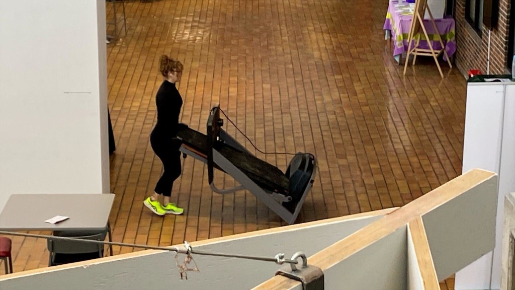 Part 2. The artist runs on a treadmill in the gallery with headphones in, listening to Shania Twain’s Forever and For Always while singing along with the song out loud in front of an audience.
